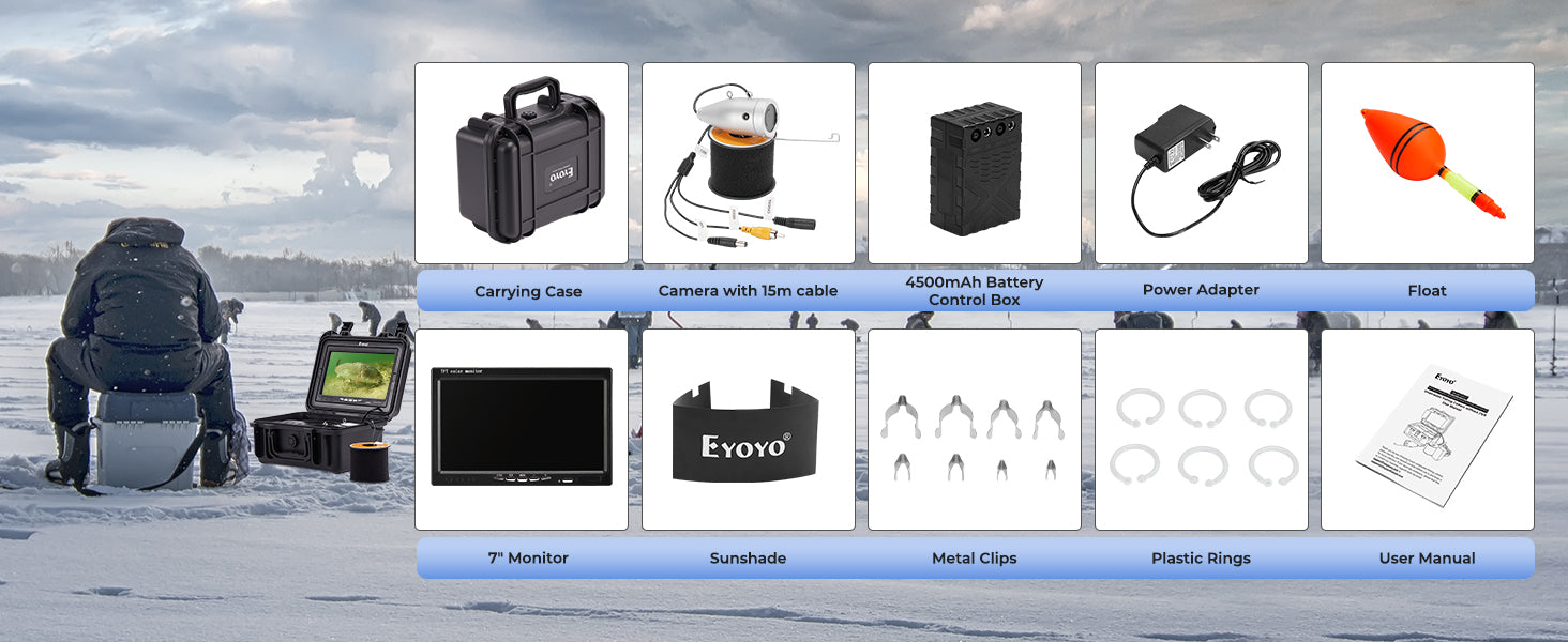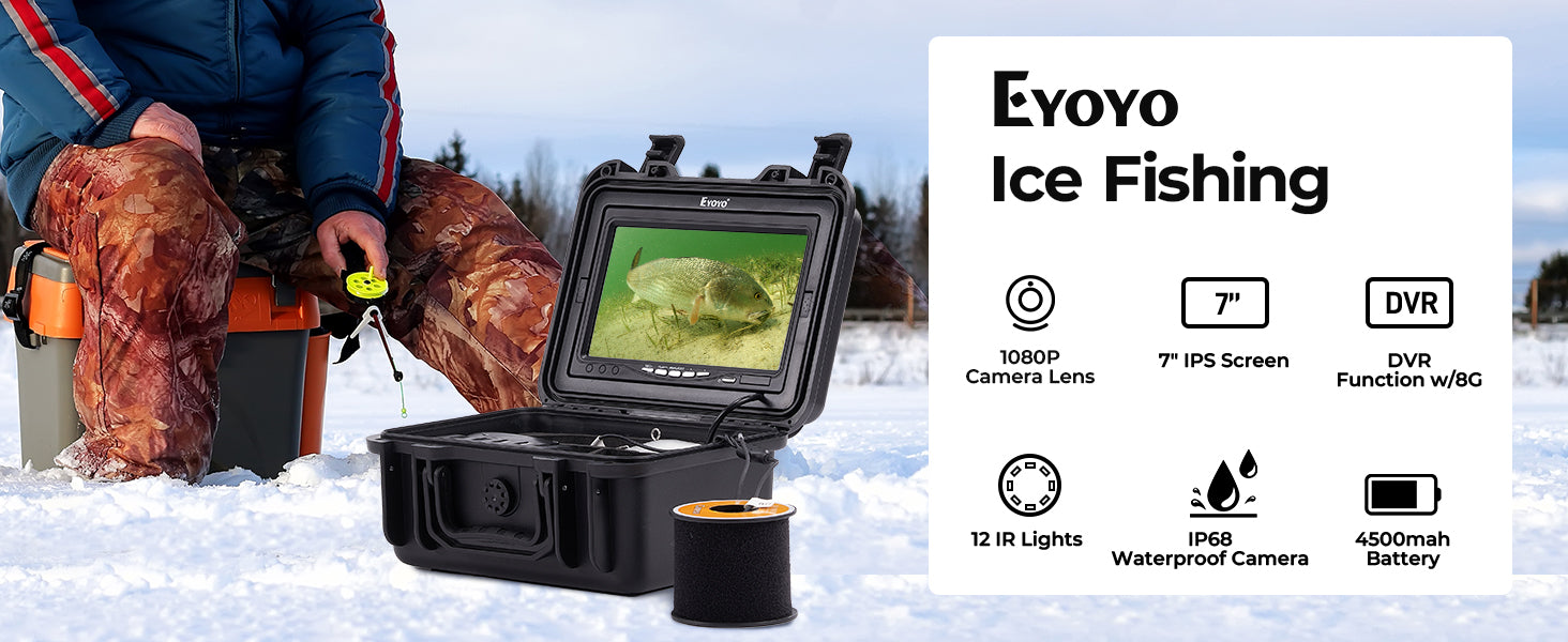 Dive into the icy depths with Eyoyo Underwater Fishing Camera featuring a 7-inch LCD, waterproof design, 1080P DVR, and 12 infrared lights. Your ultimate tool for thrilling ice fishing adventures!